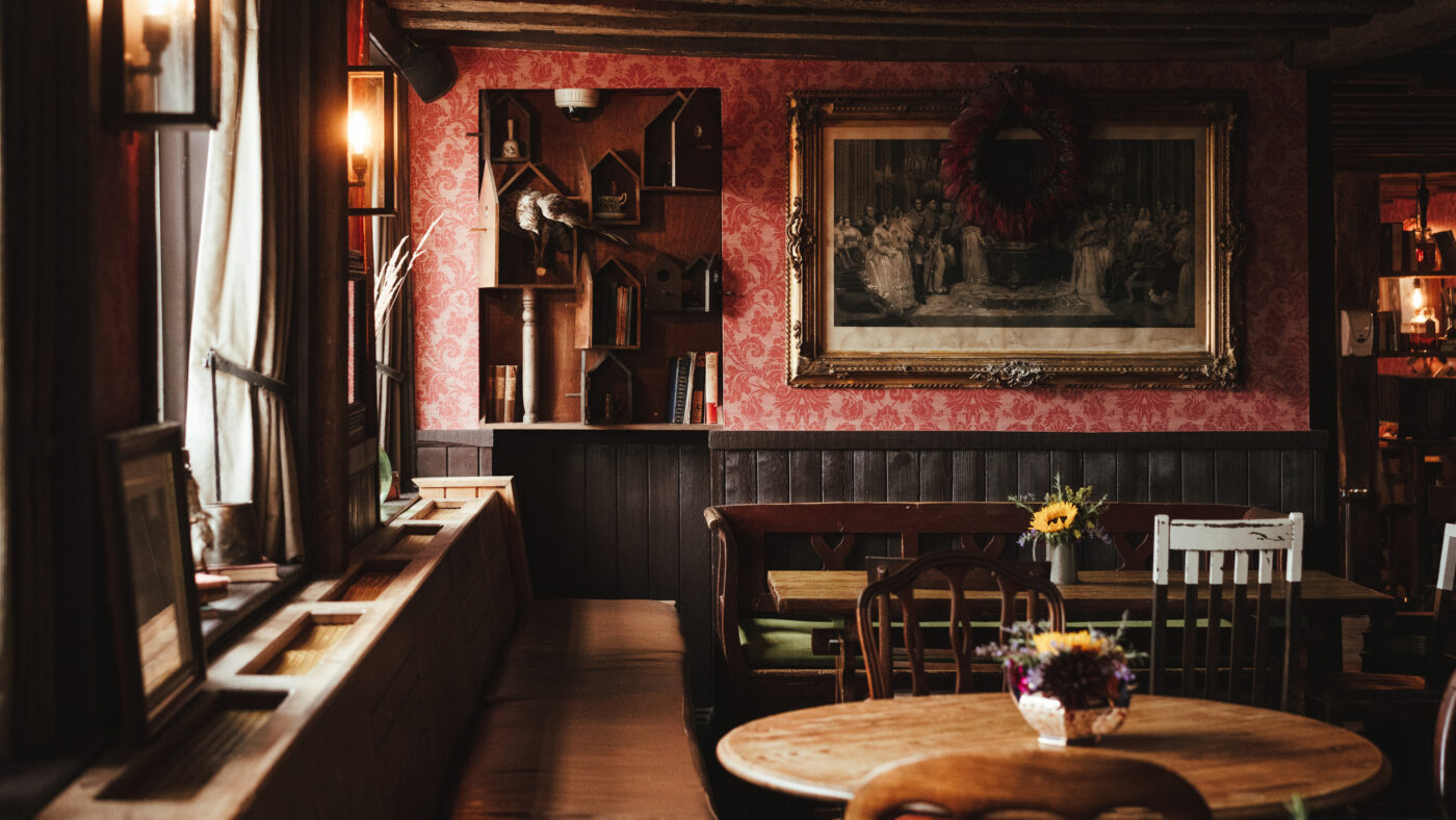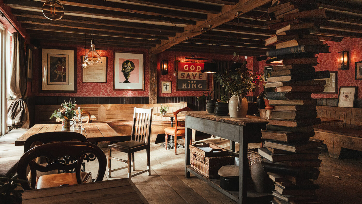 The Bell is layered and lived-in. Ancient timbers, roaring fires, treasures galore, hidden corners and rolling hills of open countryside just beyond the door.